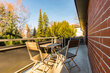 The bright living room has a large window front with exit to the balcony and is furnished with a comfortable sofa bed (160x200 cm), a coffee table, an armchair and a spacious dining table with four chairs and a flat TV. The fitted kitchen has white cabinets with dark countertop. There is a 2-surface Ceran hob with extractor hood, a dishwasher and a refrigerator. Various kitchen utensils and appliances are available, such as a kettle, coffee maker, toaster, as well as dinnerware and cookware. By arrangement, the landlady provides a microwave.