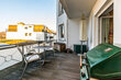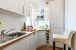 The spacious living room with access to the terrace is furnished with a cosy white sofa and a matching armchair, as well as a coffee table. A large, long wooden table with six chairs provides space for dining. Art on the walls gives the room a cosy character. Technical equipment includes a flat-screen TV with cable connection and a hi-fi system. The approx. 12 m2 terrace is furnished with a table with 2 chairs and a barbecue. The narrow, modern kitchen (approx. 6 m2) with white fronts is approx. 6 m2 in size and very well equipped. There is a ceramic hob with extractor fan, an oven, a microwave, a dishwasher and a fridge-freezer.