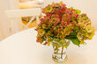 The spacious living room with floor-to-ceiling windows and access to the sunny balcony is furnished in light tones, including a beige sofa and a flat TV with cable connection. There is a desk and a chair in front of the window. The kitchen has a white, built-in counter with a ceramic glass stovetop with oven and extractor fan, a dishwasher and a fridge with freezer compartment. The washing machine and dryer are located in the kitchen. There is also a breakfast table for two people.