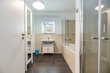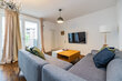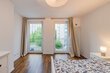 The living room is modern equipped. Floor-to-ceiling windows let in plenty of light. The separate, large kitchen-cum-living-room (20 sqm) with a French balcony is equipped with all the important technical appliances (e.g. cooker with ceramic hob, fridge/freezer combination and dishwasher). Various kitchen utensils, such as coffee machine, kettle, cooking and eating utensils are provided. There is also a dining table that seats at least four people.