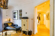 The living room is furnished with a large, comfortable leather couch, a coffee table, a chaise longue and a flat-screen TV with cable connection. From the living room you have direct access to the balcony with a view of a small square. The balcony offers seating for 2 people and a bistro table. The eat-in kitchen is approx. 12 square meters in size and still has the original tiles from the 1910s. The fitted kitchenette is equipped with a ceramic hob (4 hobs / not shown in photos), an oven, a washing machine and a fridge/freezer combination. Various kitchen utensils are provided, e.g. blender, toaster, kettle, cooking utensils, crockery and tea towels. A dining table for up to 3 people invites you to linger.