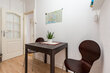 The living room/bedroom is modern and furnished to a high standard. There is a light-coloured sofa (sofa bed for visitors with a good mattress) and several small armchairs. Opposite on the wall is a chest of drawers on which the flat screen TV (50") with cable connection and Internet TV is located. Next to it is a small workstation with a desk and chair. Together with colourful lamps and a colourful carpet, a few designer pieces create a cosy and stylish atmosphere. The double bed (140 x 200 cm) has bed drawers that serve as additional storage space. The brightly tiled bathroom has the following facilities: bathtub with shower, heated towel rail, and toilet. Duvets, bed linen, towels, and pillows are provided.