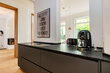 The pure living space without outside areas is approx. 70 square metres. The living area has direct access to the terrace and garden via two patio doors. The living area is divided into a living room and dining room, which are connected by a wide passageway. This means you can also see the fireplace from the dining room. The technical equipment includes a Smart TV with cable connection / digital HD TV, fibre optic network, and a compact system with CD player. The semi-open kitchen has custom-made fitted units in matt black with an induction hob (4 hobs) with fresh air extractor fan, an oven, a dishwasher, and a Quooker tap.