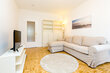 El amplio salón, con ventanales y acceso al soleado balcón, está amueblado en tonos claros e incluye un sofá beige y un televisor de pantalla plana con cable. Frente a la ventana hay una zona de trabajo con escritorio y silla. La cocina cuenta con un mueble empotrado blanco con vitrocerámica, horno y campana extractora, lavavajillas y frigorífico con congelador. La lavadora y la secadora se encuentran en la cocina. También hay una mesa de desayuno para dos personas.