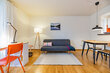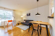 El salón es muy soleado y luminoso, con un gran ventanal y acceso al balcón. Está amueblado con un escritorio con silla, un sofá y una mesa de comedor para cuatro personas. Hay un televisor de pantalla plana con cable. Una ventana conduce a la cocina. Esta cuenta con un moderno mueble empotrado con vitrocerámica, horno, campana extractora, lavavajillas y frigorífico sin congelador. Se proporcionan diversos utensilios de cocina, como cafetera, hervidor de agua y tostadora, además de utensilios de cocina y comedor.