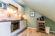 En el otro extremo del pasillo, en el tercer piso, se encuentra la cocina con una pequeña cocina y un comedor para dos personas debajo de la ventana mirador. La cocina está totalmente equipada con frigorífico, vitrocerámica de cuatro fuegos y campana extractora, horno y fregadero. Se proporcionan todos los utensilios de cocina necesarios y pequeños electrodomésticos, como una cafetera y un hervidor de agua.