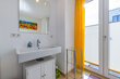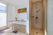 Im oberen Bereich im 3.OG befindet sich das Schlafzimmer mit einem hochwertigen Boxspringbett (160x200 cm) von Jensen. Bettdecken, Kopfkissen und Bettwäsche werden gestellt. Von diesem Zimmer gelangt man auf den zweiten Süd-Balkon. Des Weiteren befindet sich in der oberen Etage das moderne Tageslicht-Badezimmer mit Badewanne, ebenerdiger Dusche, Fußbodenheizung und Handtuchheizung. Der Waschtrockner steht ebenso im Badezimmer. Im Flur gibt es einen Einbauschrank mit viel Stauraum. Zur Wohnung gehört ein Kellerraum. Ein Fahrradkeller ist ebenfalls im Gebäude vorhanden.