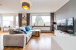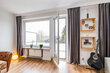 Der große Wohnbereich ist in drei Funktionen eingeteilt: in einen Arbeitsbereich mit Schreibtisch und Schreibtischstuhl, einen Wohnbereich mit gemütlichen grauem Ecksofa (mit Schlaffunktion, Liegefläche wird elektrisch ausgefahren) und großem Flat-TV (65-Zoll, Kabelanschluss) und einen Essbereich mit einem Holztisch mit vier Lederstühlen. Von hier gibt es Zugang zum ca. 7 qm großen Westbalkon mit weitem Blick über den großen Platz.