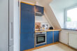 Das große Wohnzimmer mit zwei Fenstern teilt sich auf in einen Wohnbereich mit einem Ecksofa und Sessel, und einen Essbereich mit einem Esstisch für bis zu sechs Personen. An technischer Ausstattung steht ein 42" Flat-TV mit Kabelanschluss und ein Blu-ray Player zur Verfügung. Die separate Küche (ca. 7 qm) hat eine Durchreiche zum Essbereich. Die blaue Einbauzeile ist mit einem Ceranherd mit Backofen und Dunstabzug, einer Kühl-Gefrierkombination und einer Spülmaschine ausgestattet. Diverse Küchengeräte, Kochgeschirr, Essgeschirr und Geschirrtücher werden zur Verfügung gestellt.