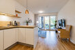 Das Wohnzimmer hat bodentiefe Fenster und ist mit einem Sofa mit Couchtisch, einem Korbstuhl und einem Flat-TV möbliert. Von hier hat man direkten Zugang auf den Balkon. Die moderne Küche ist offen zum Wohnbereich und optisch durch einen Küchentresen mit 2 Barhockern getrennt. Sie ist komplett ausgestattet u. a. mit einem Ceranherd (4 Kochfelder), einer Dunstabzugshaube, einem Backofen, eine Kühl-/Gefrierkombi und einem Geschirrspüler. Diverse Küchenutensilien, Kochgeschirr, Essgeschirr und Geschirrtücher sind vorhanden.