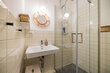 Das kleine Badezimmer (ca. 4qm) wurde modernisiert und ist mit einer Rainshower-Dusche mit Glasabtrennung, einem Waschbecken und ein WC ausgestattet. Handtücher werden bereitgestellt. Im Flur befindet sich ein großer Einbauschrank der viel Stauraum bietet. Ein eigenes, verschließbares Kellerabteil kann genutzt werden.