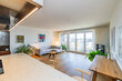 Der Grundriss ist offen und großzügig gestaltet. Das Wohn-/Esszimmer verfügt über eine große Fensterfront, welche auf eine Loggia führt. Der Raum ist mit einem gemütlichen Ecksofa und TV ausgestattet (Flat-TV, 65"). Der offen Küchenbereich (integriert im Wohnbereich) ist durch einen Tresen abgetrennt. Barhocker bieten Platz zum Sitzen. Eine moderne Küchenzeile ist mit diversen technischen Geräten ausgestattet, wie z.B. Induktionskochfeld, Backofen, Dunstabzug, Spülmaschine und einer Kühl-/Gefrierkombination. Diverse Küchenutensilien werden gestellt, wie Espressomaschine, Essgeschirr, Geschirrtücher, Kochgeschirr, SodaStream, Toaster und Wasserkocher. Eine hübsche, antike Vitrine ist ein schöner Eyecatcher zwischen der modernen Möblierung.
